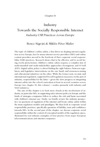 Ságvári, Bence and Máder, Miklós Péter (2013) Towards the Socially Responsible Internet: Industry CSR Practices Across Europe. In: Towards a Better Internet for Children?: Policy Pillars, Players and Paradoxes. Nordicom, Göteborg.