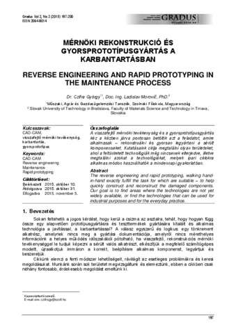 Czifra, György and Morovič, Ladislav (2015) Mérnöki rekonstrukció és gyorsprototípusgyártás a karbantartásban = Reverse Engineering and Rapid Prototyping in the Maintenance Process. GRADUS, 2 (2). pp. 197-200. ISSN 2064-8014