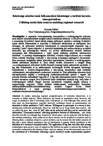 Hornyák, Miklós (2014) Közösségi adatforrások felhasználási lehetőségei a területi kutatás támogatásában. GRADUS, 1 (2). pp. 230-237. ISSN 2064-8014