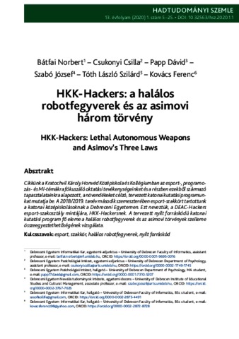 Bátfai, Norbert and Csukonyi, Csilla and Papp, Dávid and Szabó, József and Tóth, László Szilárd (2020) HKK-Hackers: a halálos robotfegyverek és az asimovi három törvény = HKK-Hackers: Lethal Autonomous Weapons and Asimov’s Three Laws. HADTUDOMÁNYI SZEMLE, 13 (1). pp. 5-25. ISSN 2060-0437