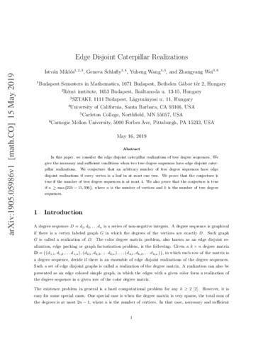 Miklós, István and Schlafly, G. and Wang, Y. and Wei, Z. (2020) Edge Disjoint Caterpillar Realizations. DISCRETE APPLIED MATHEMATICS. ISSN 0166-218X