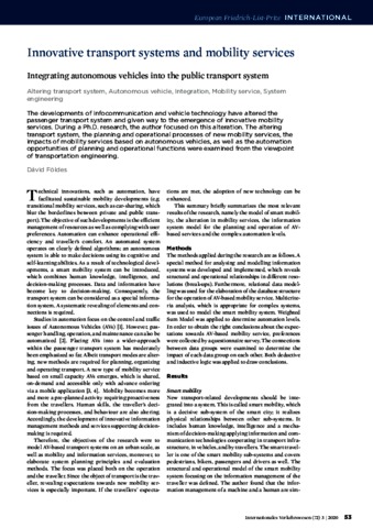 Földes, Dávid (2020) Innovative transport systems and mobility services : Integrating autonomous vehicles into the public transport system. INTERNATIONALES VERKEHRSWESEN: FACHZEITSCHRIFT FUR WISSENSCHAFT UND PRAXIS, 72 (3). pp. 53-55. ISSN 0020-9511
