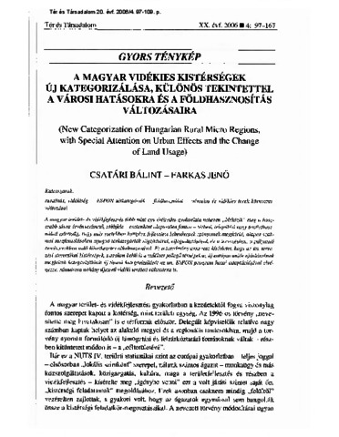 Farkas, Jenő and Csatári, Bálint (2006) A magyar vidékies kistérségek új kategorizálása, különös tekintettel a városi hatásokra és a földhasznosítás változásaira. Tér és Társadalom, 20 (4). pp. 97-109. ISSN 0237-7683