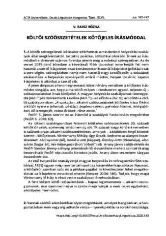V. Raisz, Rózsa (2020) Költői szóösszetételek kötőjeles írásmóddal. Az Eszterházy Károly Egyetem tudományos közleményei (Új sorozat 46. köt.) = Acta Universitatis de Carolo Eszterhazy Nominatae. Sectio Linguistica Hungarica, 46. pp. 143-147. ISSN 2631-0198