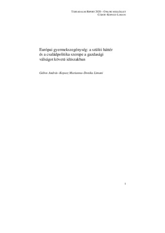 Gábos, András and Kopasz, Marianna and Limani, Donika (2020) Európai gyermekszegénység: a szülői háttér és a családpolitika szerepe a gazdasági válságot követő időszakban. In: Társadalmi Riport 2020. TÁRKI, Budapest, pp. 309-331. ISBN 9771216656206