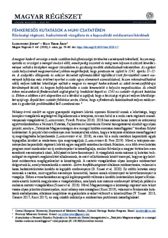 Laszlovszky, József and Rácz, Tibor Ákos (2020) Fémkeresős kutatások a muhi csatatéren : Közösségi régészet, hadszínterek vizsgálata és a kapcsolódó módszertani kérdések. Magyar Régészet, 9 (4). pp. 70-80. ISSN 2416-0288