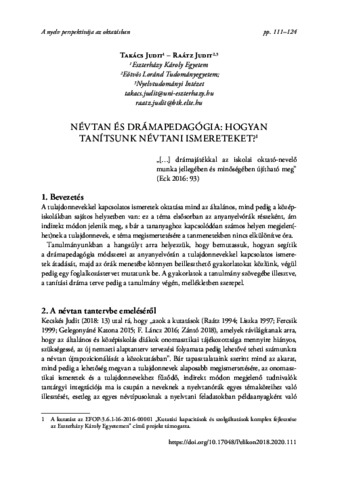 Takács, Judit and Raátz, Judit (2020) Névtan és drámapedagógia: Hogyan tanítsunk névtani ismereteket? In: A nyelv perspektívája az oktatásban : Válogatás a PeLiKon2018 oktatásnyelvészeti konferencia előadásaiból. EKE Líceum Kiadó, Eger, pp. 111-124. ISBN 978-963-496-168-0