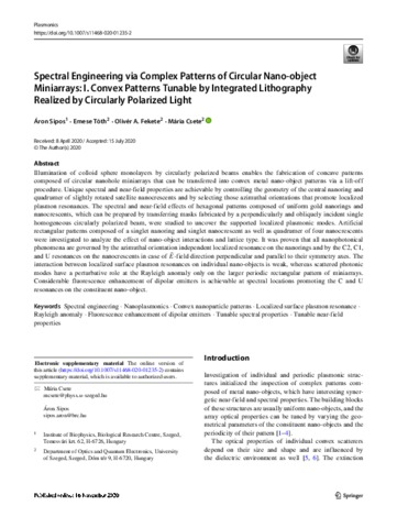 Sipos, Áron and Tóth, Emese and Fekete, Oliver A. and Csete, Maria (2020) Spectral Engineering via Complex Patterns of Circular Nano-object Miniarrays: I. Convex Patterns Tunable by Integrated Lithography Realized by Circularly Polarized Light. Plasmonics. ISSN 1557-1955, ESSN: 1557-1963