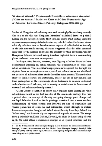 Mátay, Mónika (2012) “A városok szíverek.” Tanulmányok Kassáról és a reformkori városokról [“Cities are Arteries.” Studies on Kassa and Other Towns in the Age of Reforms]. By Gábor Czoch. Pozsony: Kalligram, 2009. 209 pp. HUNGARIAN HISTORICAL REVIEW: NEW SERIES OF ACTA HISTORICA ACADEMIAE SCIENTIARIUM HUNGARICAE, 1 (1-2). pp. 240-244. ISSN 2063-8647