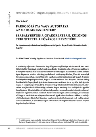 Illés, Kristóf (2020) Parkolópálya vagy autópálya az M3 business center? Szabálysértés a gyakorlatban, különös tekintettel a főváros helyzetére = Jurisprudence of Administrative Offences with Special Regard to the Situtation in the Capital. PRO PUBLICO BONO: MAGYAR KÖZIGAZGATÁS; A NEMZETI KÖZSZOLGÁLATI EGYETEM KÖZIGAZGATÁS-TUDOMÁNYI SZAKMAI FOLYÓIRATA, 8 (3). pp. 82-97. ISSN 2063-9058 (nyomtatott); 2063-9066 (online)