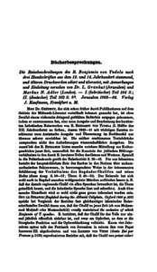 Goldziher, Ignác (1905) Die Reisebeschreibungen des R. Benjamin von Tudela nach drei Handschriften aus dem 13. und 14. Jahrhundert stammend, und älteren Druckwerken ediert und übersetzt, mit Anmerkungen und Einleitung versehen von Dr. L. Grünhut (Jerusalem) und Markus N. Adler (London). — I. (hebräischer) Teil 164 S.; II. (deutscher) Teil 102 S. 8°. Jerusalem 1903—04. Verlag J. Kaufmann, Frankfurt a. M. Zeitschrift des Deutschen Palästina-Vereins, 28. pp. 151-154.