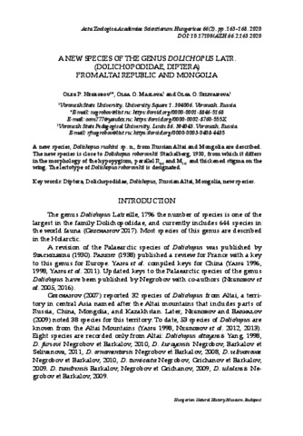 Negrobov, Oleg P. and Maslova, Olga O. and Selivanova, Olga O. (2020) A new species of the genus Dolichopus Latr. (Dolichopodidae, Diptera) from Altai Republic and Mongolia. ACTA ZOOLOGICA ACADEMIAE SCIENTIARUM HUNGARICAE, 66 (2). pp. 163-168. ISSN 1217-8837