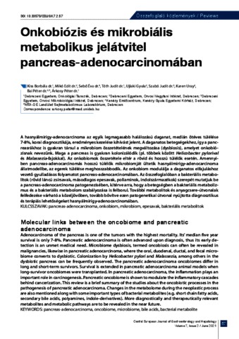 A hasnyálmirigy-adenocarcinoma az egyik legmagasabb halálozású daganat, medián ötéves túlélése 7-8%, korai diagnosztikája, eredményes kezelése kihívást jelent. A daganatos betegségekhez, így a panc- reasrákhoz is gyakran társul a mikrobiom összetételének megváltozása (dysbiosis), amelyet onkobiózisnak nevezünk. Maga a pancreas is gyakran kolonizálódik (pl. többek között Helicobacter pylorival és Malassezia-fajokkal). Az onkobiomok összetétele eltér a rövid és hosszú túlélők esetén. Amennyiben pancreas-adenocarcinomás hosszú túlélők mikrobiomját ültetik hasnyálmirigy-adenocarcinoma állatmodellbe, az egerek túlélése meghosszabbodik. Az onkobiom modulálja a daganatos elfajuláshoz vezető gyulladásos folyamatot pancreas-adenocarcinomában. Az összefoglalóban a bakteriális metabolitok (rövid láncú zsírsavak, másodlagos epesavak, poliaminok, indolszármazékok) szerepét mutatjuk be a pancreas-adenocarcinoma patogenezisében, kitérve arra, hogy a betegségben a bakteriális metabolizmus és a bakteriális metabolom szabályozása is felborul. További metabolitok és anyagcsere-útvonalak felfedezése várható a közeljövőben, tovább bővítve ezen patogenetikai útvonal nyújtotta diagnosztikus és terápiás lehetőségeket hasnyálmirigy-adenocarcinomában. KULCSSZAVAK: pancreas-adenocarcinoma, onkobiom, mikrobiom, epesavak, bakteriális metabolitok