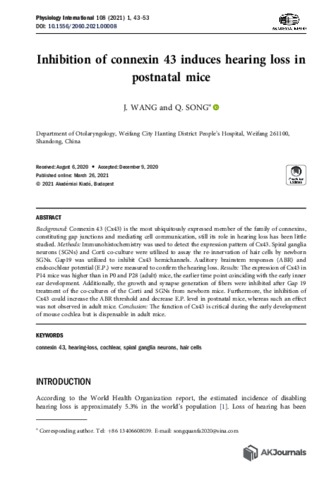 Wang, J. and Song, Q. (2021) Inhibition of connexin 43 induces hearing loss in postnatal mice. Physiology International, 108 (1). pp. 43-53. ISSN 2498-602X