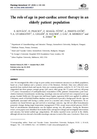 Kovács, Enikő and Pilecky, D. and Szakál-Tóth, Zsófia and Fekete-Győr, A. and Gyarmathy, V.A. and Gellér, László Alajos and Hauser, Balázs and Gál, János and Merkely, Béla Péter and Zima, Endre István (2020) The role of age in post-cardiac arrest therapy in an elderly patient population. Physiology International, 107 (2). pp. 319-336. ISSN 2498-602X