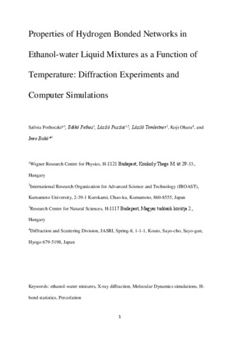 Pothoczki, Szilvia and Pethes, Ildikó and Pusztai, László and Temleitner, László and Ohara, Koji (2021) Properties of Hydrogen-Bonded Networks in Ethanol-Water Liquid Mixtures as a Function of Temperature: Diffraction Experiments and Computer Simulations. JOURNAL OF PHYSICAL CHEMISTRY B - CONDENSED MATTER MATERIALS SURFACES INTERFACES AND BIOPHYSICAL, 125 (23). pp. 6272-6279. ISSN 1520-6106