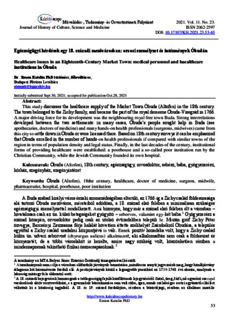 Simon, Katalin (2021) Egészségügyi kérdések egy 18. századi mezővárosban: orvosi személyzet és intézmények Óbudán. KALEIDOSCOPE : MŰVELŐDÉS- TUDOMÁNY- ÉS ORVOSTÖRTÉNETI FOLYÓIRAT. ISSN 2062-2597 (Submitted)