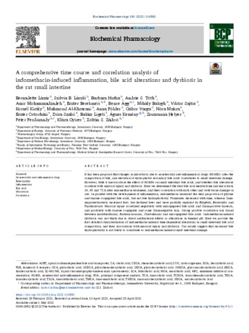 Lázár, Bernadette and László, Szilvia Bianka and Hutka, Barbara and Tóth, András Sebestyén and Mohammadzadeh, Amir and Berekméri, Eszter and Ágg, Bence and Balogh, Mihály and Király, Kornél P and Al-Khrasani, Mahmoud and Földes, Anna and Varga, Gábor and Makra, Nóra and Ostorházi, Eszter and Szabó, Dóra and Kemény, Ágnes and Helyes, Zsuzsanna and Ferdinandy, Péter and Gyires, Klára and Zádori, Zoltán Sándor (2021) A comprehensive time course and correlation analysis of indomethacin-induced inflammation, bile acid alterations and dysbiosis in the rat small intestine. BIOCHEMICAL PHARMACOLOGY, 190. ISSN 0006-2952