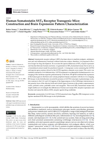 Nemes, Balázs and Bölcskei, Kata and Kecskés, Angéla and Kormos, Viktória and Gaszner, Balázs and Aczél, Timea and Pintér, Erika and Helyes, Zsuzsanna and Sándor, Zoltán (2021) Human Somatostatin SST4 Receptor Transgenic Mice: Construction and Brain Expression Pattern Characterization. INTERNATIONAL JOURNAL OF MOLECULAR SCIENCES, 22 (7). ISSN 1661-6596
