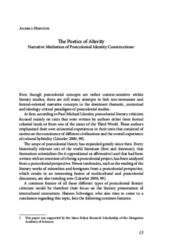 Horváth, Andrea (2020) The Poetics of Alterity: Narrative Mediation of Postcolonial Identity Constructions. In: Intercultural occurrences : diversity and alterity. Cultures, Contexts, Identities (2). Debrecen Reformed Theological University, Partium, Debrecen, Oradea, pp. 13-24. ISBN 978-615-5853-31-9