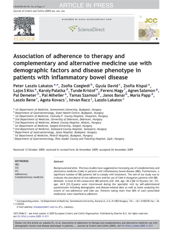 Lakatos, Péter László and Czeglédi, Zsófia and Dávid, Gyula and Kispál, Zsófia and Kiss, Lajos Sándor and Palatka, Károly and Miheller, Pál and Szamosi, Tamás and Papp, Mária and Bene, László and Lakatos, László (2010) Association of adherence to therapy and complementary and alternative medicine use with demographic factors and disease phenotype in patients with inflammatory bowel disease. JOURNAL OF CROHN'S & COLITIS , 4 (3). pp. 283-290. ISSN 1873-9946