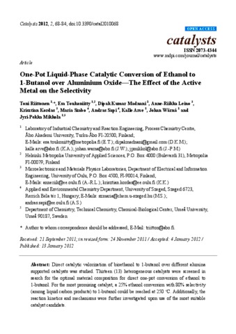 Riittonen, Toni and Toukoniitty, Esa and Madnani, Dipak Kumar and Leino, Anne-Riikka and Kordás, Krisztián and Szabó, Mária and Sápi, András (2012) One-Pot Liquid-Phase Catalytic Conversion of Ethanol to 1-Butanol over Aluminium Oxide—The Effect of the Active Metal on the Selectivity. CATALYSTS, 2 (1). pp. 68-84. ISSN 2073-4344
