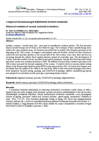 Saláta, József (2021) A fogászati kerámiaanyagok fejlődésének történeti áttekintése = Historical evolution of ceramic materials in dentistry. KALEIDOSCOPE: MŰVELŐDÉS- TUDOMÁNY- ÉS ORVOSTÖRTÉNETI FOLYÓIRAT, 11 (22). pp. 284-293. ISSN 2062-2597