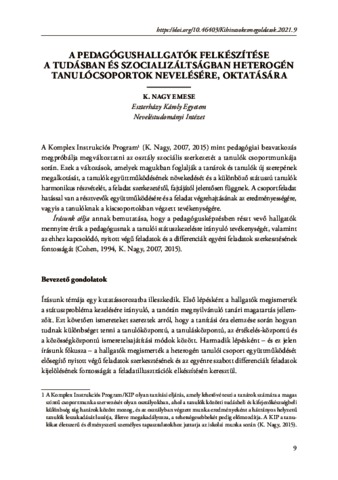 K. Nagy, Emese (2021) A pedagógushallgatók felkészítése a tudásban és szocializáltságban heterogén tanulócsoportok nevelésére, oktatására. In: Kihívások és megoldások a XXI. század pedagógiájában : Válogatás a Pedagógiai Szakbizottság tagjainak a munkáiból. Eszterházy Károly Katolikus Egyetem Líceum Kiadó, Eger, pp. 9-26. ISBN 978-963-496-212-0 (print) ; 978-963-496-218-2 (online)