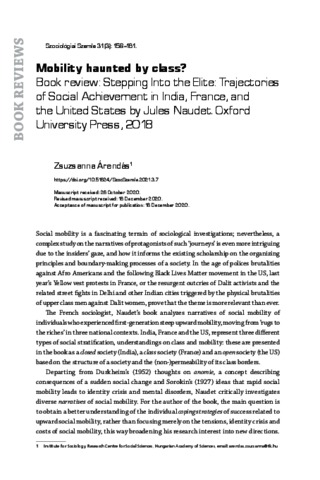 Árendás, Zsuzsanna (2021) Mobility haunted by class? Book review: Stepping Into the Elite: Trajectories of Social Achievement in India, France, and the United States by Jules Naudet. Oxford University Press, 2018. SZOCIOLÓGIAI SZEMLE, 31 (3). pp. 158-161. ISSN 1216-2051