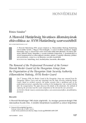 Fórizs, Sándor (2021) A Honvéd Határőrség hivatásos állományának eltávolítása az ÁVH Határőrség szervezetéből = The Removal of the Professional Personnel of the Former Honvéd Border Guard (of the Hungarian Army) from the Organisation of the Hungarian State Security Authority (Államvédelmi Hatóság, ÁVH) Border Guard. HADTUDOMÁNY: A MAGYAR HADTUDOMÁNYI TÁRSASÁG FOLYÓIRATA, 31 (2). pp. 107-117. ISSN 1215-4121 (nyomtatott); 1588-0605 (elektronikus)
