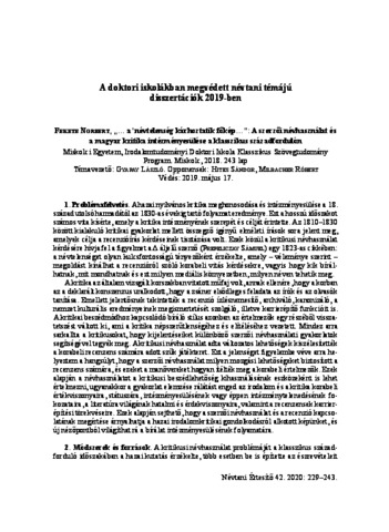 Fekete, Norbert (2020) A doktori iskolákban megvédett névtani témájú disszertációk 2019-ben: Fekete Norbert, „… a’ névtelenség kárhoztatik főkép…”: A szerzői névhasználat és a magyar kritika intézményesülése a klasszikus századfordulón. NÉVTANI ÉRTESÍTŐ, 42. pp. 229-239. ISSN 0139-2190 (nyomtatott); 2064-7484 (online)