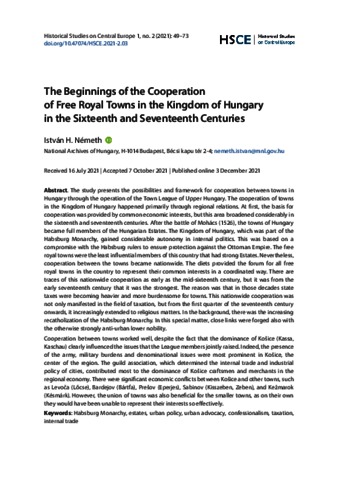 Németh, István (2021) The Beginnings of the Cooperation of Free Royal Towns in the Kingdom of Hungary in the Sixteenth and Seventeenth Centuries. HISTORICAL STUDIES ON CENTRAL EUROPE, 1 (2). pp. 49-73. ISSN 2786-0930