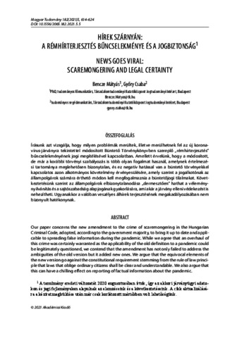 Bencze, Mátyás and Győry, Csaba (2021) Hírek szárnyán: a rémhírterjesztés bűncselekménye és a jogbiztonság • News Goes Viral: Scaremongering and Legal Certainty. MAGYAR TUDOMÁNY, 182. ISSN 0025-0325