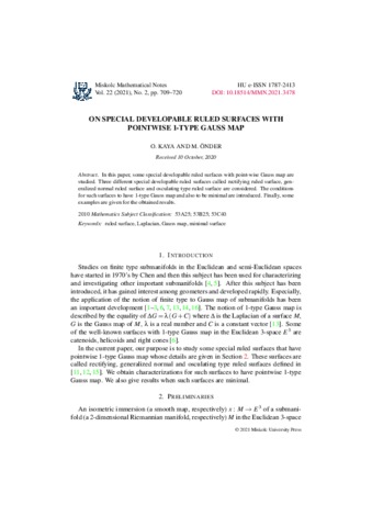 Kaya, O. and Önder, M. (2021) On special developable ruled surfaces with pointwise 1-type Gauss map. Miskolc Mathematical Notes, 22 (2). pp. 709-720. ISSN 1787-2413