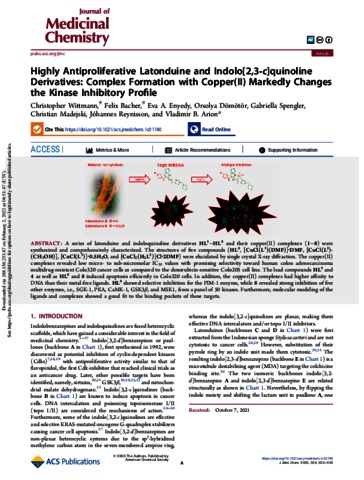 Wittmann, Christopher and Bacher, Felix and Enyedy, Éva A. and Dömötör, Orsolya and Spengler, Gabriella and Madejski, Christian and Reynisson, Jóhannes and Arion, Vladimir B. (2022) Highly Antiproliferative Latonduine and Indolo[2,3- c] Quinoline Derivatives: Complex Formation with Copper(II) Markedly Changes the Kinase Inhibitory Profile. JOURNAL OF MEDICINAL CHEMISTRY. pp. 1-24. ISSN 0022-2623 (print); 1520-4804 (online)