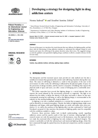 Sadoud, Nesma and Zoltán, Erzsébet Szeréna (2021) Developing a Strategy for Designing Light in Drug Addiction Centers. POLLACK PERIODICA : AN INTERNATIONAL JOURNAL FOR ENGINEERING AND INFORMATION SCIENCES, 16 (1). pp. 151-156. ISSN 1788-1994 (print); 1788-3911 (online)