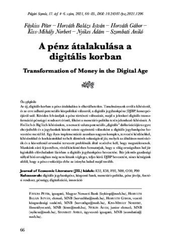 Fáykiss, Péter and Horváth, Balázs István and Horváth, Gábor and Kiss-Mihály, Norbert and Nyikes, Ádám and Szombati, Anikó (2021) A pénz átalakulása a digitális korban = Transformation of Money in the Digital Age. POLGÁRI SZEMLE : GAZDASÁGI ÉS TÁRSADALMI TUDOMÁNYOS FOLYÓIRAT = CIVIC REVIEW : JOURNAL OF ECONOMIC AND SOCIAL SCIENCES, 17 (4-6). pp. 66-83. ISSN 1786-6553 (nyomtatott); 1786-8823 (elektronikus)