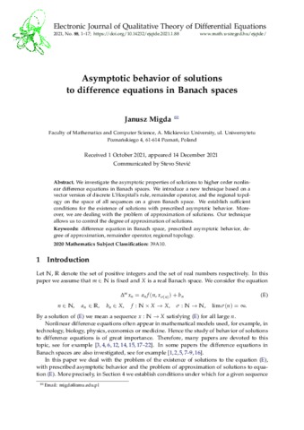 Migda, Janusz (2021) Asymptotic behavior of solutions to difference equations in Banach spaces. Electronic Journal of Qualitative Theory of Differential Equations, 2021 (88). pp. 1-17. ISSN 1417-3875