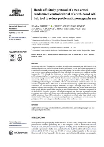 Bőthe, Beáta and Baumgartner, Christian and Schaub, Michael P. and Demetrovics, Zsolt and Orosz, Gábor (2020) Hands-Off: Study Protocol of a Two-Armed Randomized Controlled Trial of a Web-Based Self-Help Tool to Reduce Problematic Pornography Use. JOURNAL OF BEHAVIORAL ADDICTIONS, 9 (2). pp. 433-445. ISSN 2062-5871 (print); 2063-5303 (online)