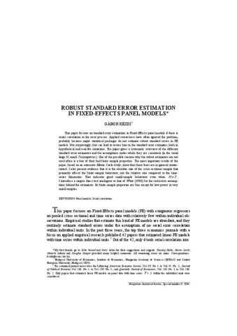 This paper focuses on standard error estimation in Fixed-Effects panel models if there is serial correlation in the error process. Applied researchers have often ignored the problem, probably because major statistical packages do not estimate robust standard errors in FE models. Not surprisingly, this can lead to severe bias in the standard error estimates, both in hypothetical and real-life situations. The paper gives a systematic overview of the different standard error estimators and the assumptions under which they are consistent (in the usual large N, small T asymptotics). One of the possible reasons why the robust estimators are not used often is a fear of their bad finite sample properties. The most important results of the paper, based on an extensive Monte Carlo study, show that those fears are in general unwarranted. I also present evidence that it is the absolute size of the cross-sectional sample that primarily affects the finite-sample behaviour, not the relative size compared to the time-series dimension. That indicates good small-sample behaviour even when N ≈ T . I introduce a simple direct test analogous to that of White [1980] for the restrictive assumptions behind the estimators. Its finite sample properties are fine except for low power in very small samples.