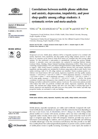 Li, Ying and Li, Guangxiao and Liu, Li and Wu, Hui (2020) Correlations Between Mobile Phone Addiction and Anxiety, Depression, Impulsivity, and Poor Sleep Quality Among College Students: A Systematic Review and Meta-Analysis. JOURNAL OF BEHAVIORAL ADDICTIONS, 9 (3). pp. 551-571. ISSN 2062-5871 (print); 2063-5303 (online)