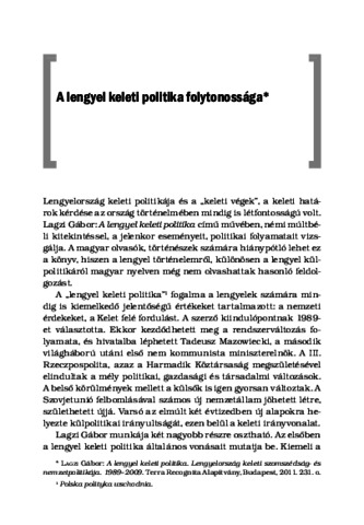 A recenzált mű: Lagzi Gábor: A lengyel keleti politika. Lengyelország keleti szomszédság- és nemzetpolitikája, 1989–2009. Terra Recognita Alapítvány, Budapest, 2011. 231 p.