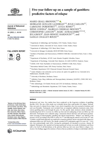 Grall-Bronnec, Marie and Guillou-Landreat, Morgane and Caillon, Julie and Dubertret, Caroline and Romo, Lucia and Codina, Irène and Chereau-Boudet, Isabelle and Lançon, Christophe and Auriacombe, Marc and Hardouin, Jean-Benoit and Challet-Bouju, Gaëlle (2021) Five-Year Follow-Up on a Sample of Gamblers: Predictive Factors of Relapse. JOURNAL OF BEHAVIORAL ADDICTIONS, 10 (1). pp. 42-54. ISSN 2062-5871 (print); 2063-5303 (online)