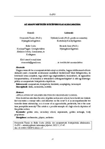 Stonawski, Tamás and Balla, Csaba (2022) Az aranymetszés középiskolai alkalmazása. OXIPO : INTERDISZCIPLINÁRIS E-FOLYÓIRAT, 4 (1). pp. 37-47. ISSN 2676-8771