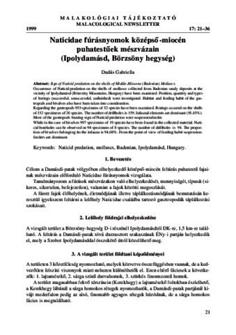 Dudás, Gabriella (1999) Naticidae fúrásnyomok középső-miocén puhatestűek mészvázain (Ipolydamásd, Börzsöny hegység). Malakológiai Tájékoztató, 17. pp. 21-36. ISSN 0230-0648