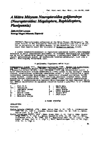 Ábrahám, Levente (1989) A Mátra Múzeum Neuropteroidea gyűjteménye (Neuropteroidea: Megaloptera, Raphidioptera, Planipennia). Folia historico-naturalia Musei Matraensis, 14. pp. 81-86. ISSN 0134-1243