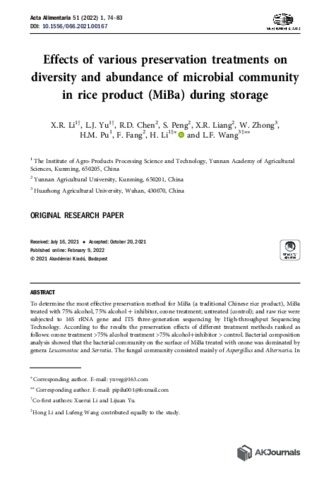 Li, X.R. and Yu, L.J. and Chen, R.D. and Peng, S. and Liang, X.R. and Zhong, W. and Pu, H.M. and Fang, F. and Li, H. and Wang, L.F. (2022) Effects of various preservation treatments on diversity and abundance of microbial community in rice product (MiBa) during storage. Acta Alimentaria, 51 (1). pp. 74-83. ISSN 0139-3006