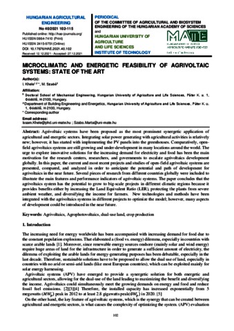 Khele, I. and Szabó, M. (2021) Microclimatic and Energetic Feasibility of Agrivoltaic Systems: State of the Art. HUNGARIAN AGRICULTURAL ENGINEERING : PERIODICAL OF THE COMMITTEE OF AGRICULTURAL AND BIOSYSTEM ENGINEERING OF THE HUNGARIAN ACADEMY OF SCIENCES (40). pp. 102-115. ISSN 0864-7410 (print); 2415-9751 (online)