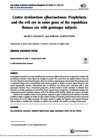Giuman, Marco and Napolitano, Miriam (2020) Contra invidentium effascinationes: Prophylaxis and the Evil Eye in Some Gems of the Republican Roman Era with Grotesque Subjects. ACTA ANTIQUA ACADEMIAE SCIENTIARUM HUNGARICAE, 60 (3-4). pp. 303-317. ISSN 0044-5975 (print); 1588-2543 (online)