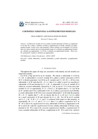 Nebiyev, Celil and Ökten, Hasan Hüseyin (2022) Cofinitely essential g-supplemented modules. Miskolc Mathematical Notes, 23 (1). pp. 381-387. ISSN 1787-2413